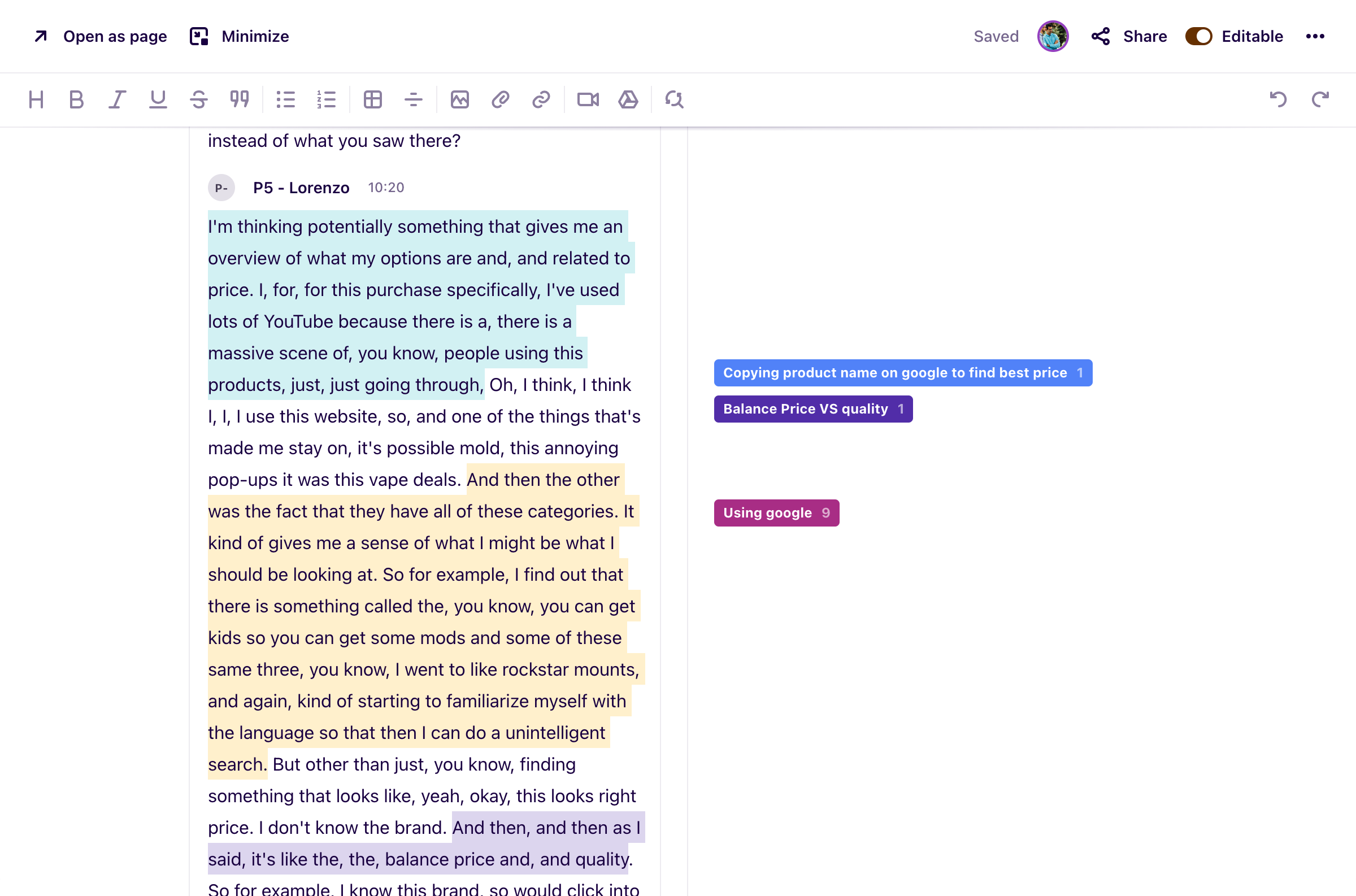 The interviews’ analysis is one of the most important steps in the research process. Using the (brilliant) tool Dovetail, the analysis of the raw data from the interviews is done through the process of thematic analysis (a well known analysis method to identify common themes from qualitative input, requiring to first immerse oneself in the data)